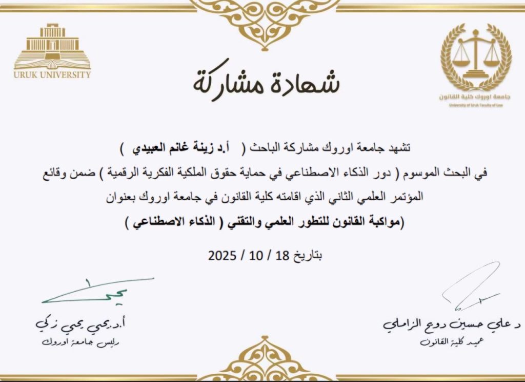 وقد حظيت مشاركة السيدة العميد بإشادة واسعة من المشاركين لما تضمنته من رؤية علمية متوازنة تجمع بين التحليل القانوني والتقني، مؤكدةً مكانة جامعة نينوى العلمية ودورها الفاعل في مواكبة المستجدات العالمية في مجالات القانون والذكاء الاصطناعي.