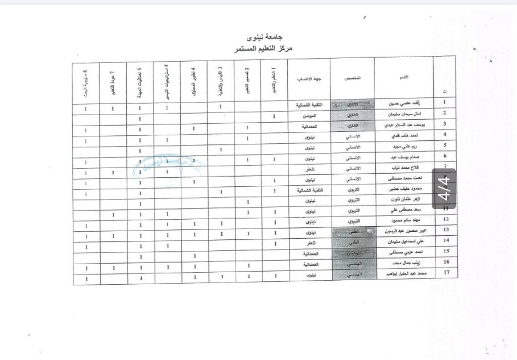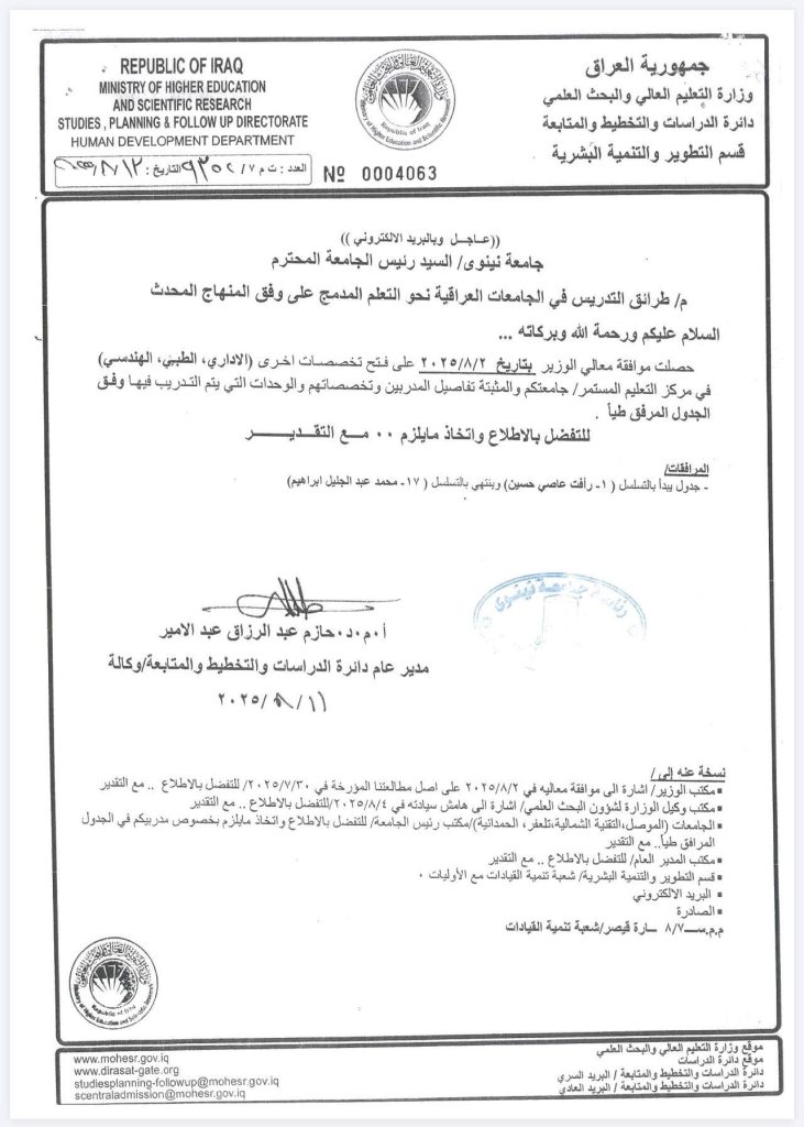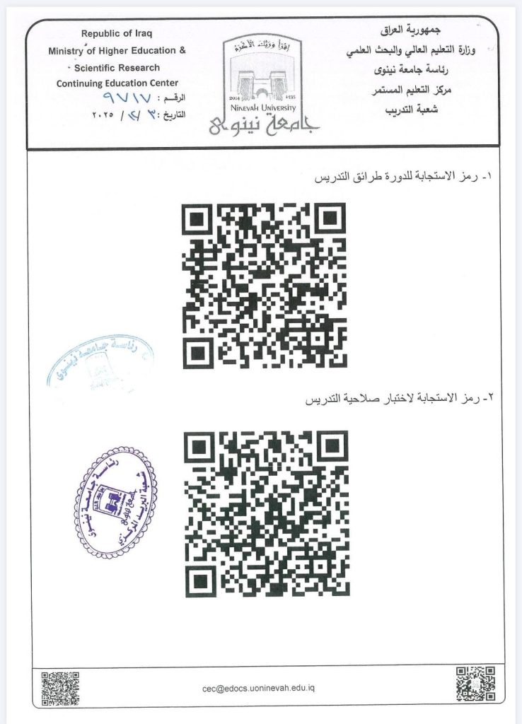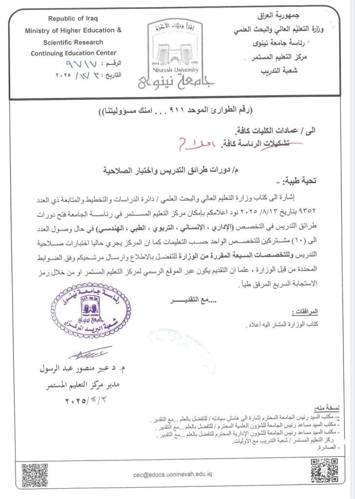 تعلن رئاسة جامعة نينوى / مركز التعليم المستمر عن فتح باب التسجيل أمام السادة التدريسيين في جميع كليات الجامعة للاشتراك في دورات طرائق التدريس للتخصصات (الإداري، الإنساني، التربوي، الطبي، الهندسي)، وذلك استناداً إلى توجيهات وزارة التعليم العالي والبحث العلمي – دائرة الدراسات والتخطيط والمتابعة.