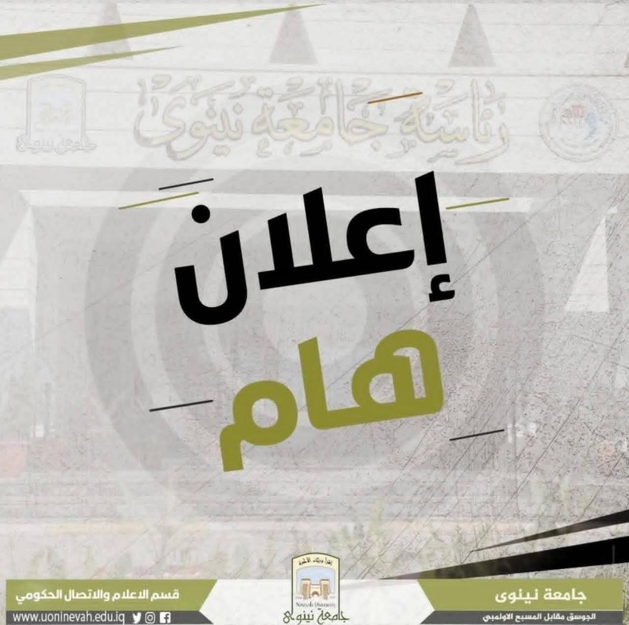 تُعلن شعبة التدريب الفني في مركز الحاسبة الإلكترونية بجامعة نينوى عن دعوة جميع الراغبين بأداء الاختبار الوطني الموحّد (اللغة الإنجليزية، الحاسوب، اللغة العربية) إلى تسديد رسوم الاختبار خلال أيام: