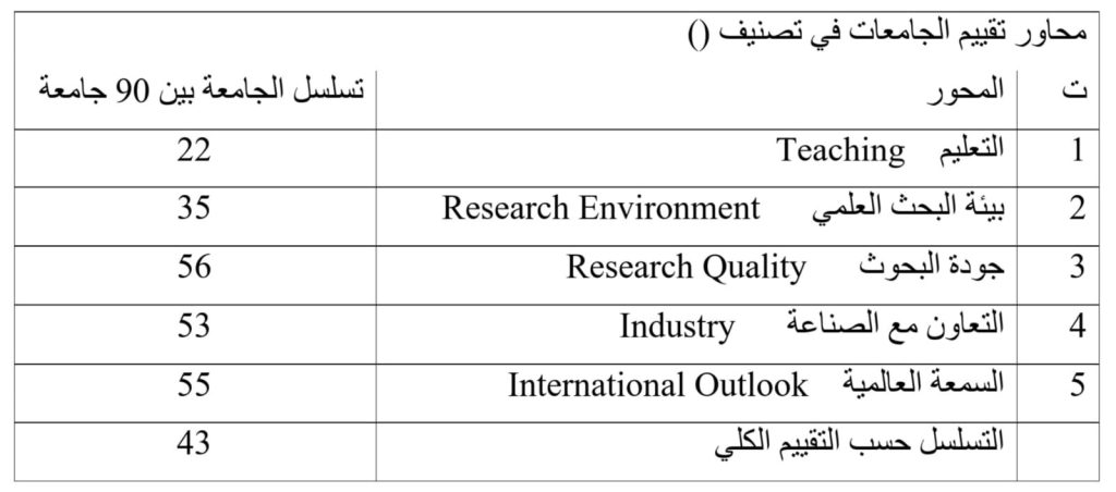 وشهد التصنيف منافسة واسعة بين الجامعات العراقية التي ازدادت مشاركتها بشكل ملحوظ. ويعتمد هذا التصنيف على تقييم أداء الجامعات في خمسة محاور رئيسية كما هو موضح في الجدول المعتمد من الجهة المانحة.