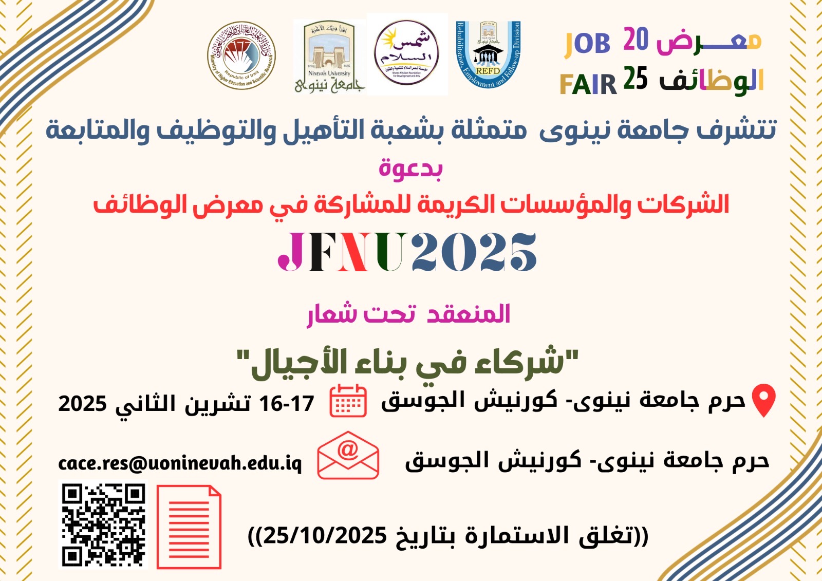 تتشرف جامعة نينوى متمثلة بشعبة التأهيل والتوظيف والمتابعة بدعوة الشركات والمؤسسات الكريمة للمشاركة في معرض الوظائف، المنعقد تحت شعار “شركاء في بناء الأجيال”.