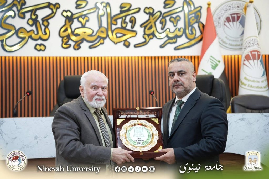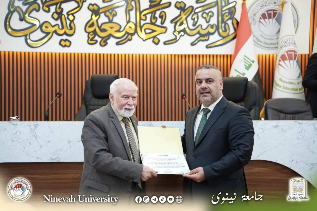 وفي ختام المحاضرة، كرّم السيد رئيسُ الجامعة الأستاذَ الدكتور إبراهيم خليل العلاف بدرع جامعة نينوى وشهادة تقديرية، تثميناً لعطائه العلمي وإسهامه في إغناء الندوة برؤية تاريخية ومعرفية عميقة حول تجربة الجامعة ومسارها التنموي.