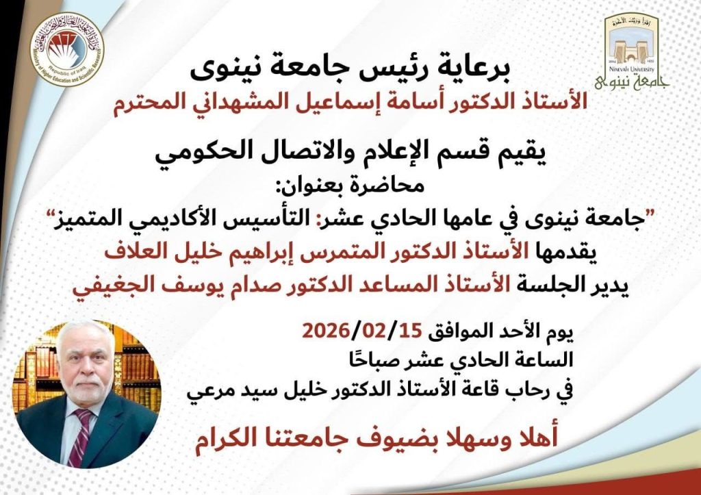 ضمن جهودها في تعزيز الحراك العلمي والثقافي واستضافة القامات الفكرية العراقية، نظّم قسم الإعلام والاتصال الحكومي في جامعة نينوى محاضرة علمية استضاف فيها المؤرخ الأستاذ الدكتور المتمرس إبراهيم خليل العلاف، حملت عنوان: «جامعة نينوى في عامها الحادي عشر: التأسيس الأكاديمي المتميّز».