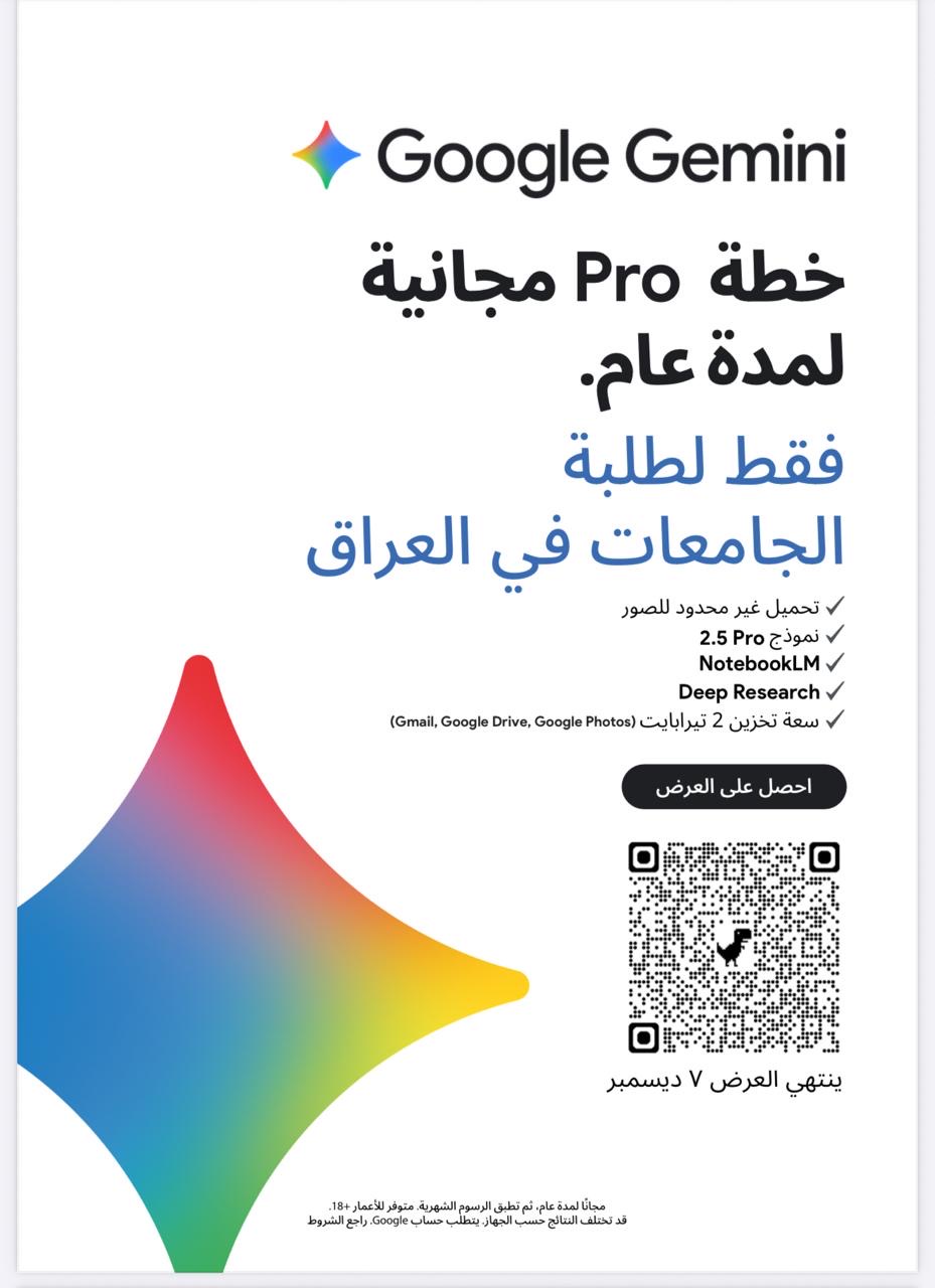 تُعلن وزارة التعليم العالي والبحث العلمي عن إطلاق عرض خاص لطلبة الجامعات في العراق، يمنح اشتراكًا مجانيًا لمدة سنة كاملة في خدمة Google Gemini Pro.