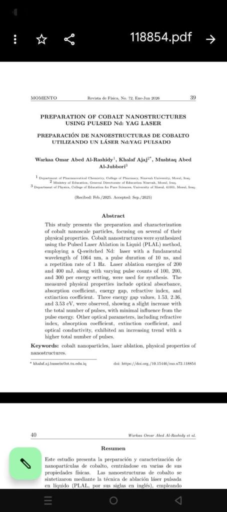 تتناول الدراسة تحضير نانوكوبالت بتقنية الاستئصال الليزري النبضي في سائل (PLAL) باستخدام ليزر Nd:YAG بطول موجي 1064 نانومتر، مع تغيير طاقة وعدد النبضات لدراسة تأثيرهما في الخصائص البصرية. حيث أظهرت النتائج ثلاث قيم لفجوة الطاقة مع زيادة طفيفة بزيادة عدد النبضات، في حين كان تأثير طاقة النبضة محدودًا، بينما ارتفعت معاملات الامتصاص والانكسار والتوصيلية البصرية بزيادة العدد الكلي للنبضات.