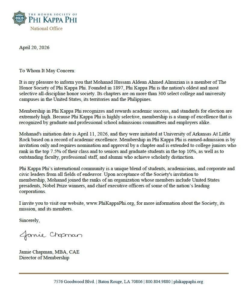 وتُعد عضوية جمعية Phi Kappa Phi من أرفع الأوسمة الأكاديمية، إذ تُمنح عن طريق الدعوة فقط، بناءً على معايير دقيقة تعتمد على التميز الأكاديمي العالي واستيفاء شروط الأهلية الصارمة. وتُعتبر الجمعية من أعرق جمعيات الشرف الأكاديمية في الولايات المتحدة، إذ تأسست عام 1897، وتهدف إلى تكريم الإنجازات العلمية والتميّز المعرفي.