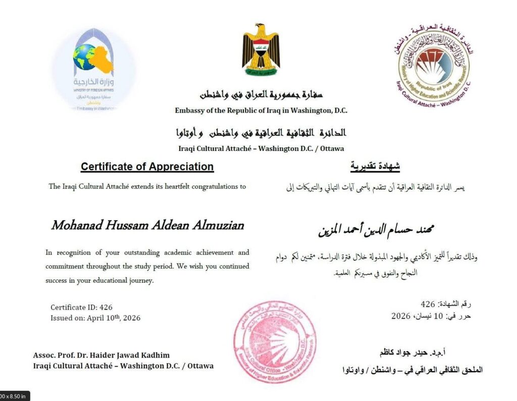 وفي سياق متصل، نال التدريسي تكريماً آخر من الملحقية الثقافية العراقية في واشنطن، تثميناً لتفوقه الأكاديمي وتميّزه خلال فترة دراسته.