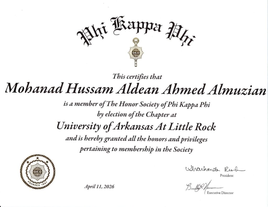 في إنجاز أكاديمي متميز يُضاف إلى رصيد جامعة نينوى، حظي التدريسي في جامعة نينوى من الموفدين للدراسة في الولايات المتحدة الأمريكية السيد (مهند حسام الدين أحمد المزين) بتكريم رفيع من Phi Kappa Phi، وذلك بعد ترشيحه من قبل University of Arkansas at Little Rock تقديراً لتفوقه العلمي، حيث صُنّف ضمن نخبة طلبة الدراسات العليا المتميزين في الجامعة.