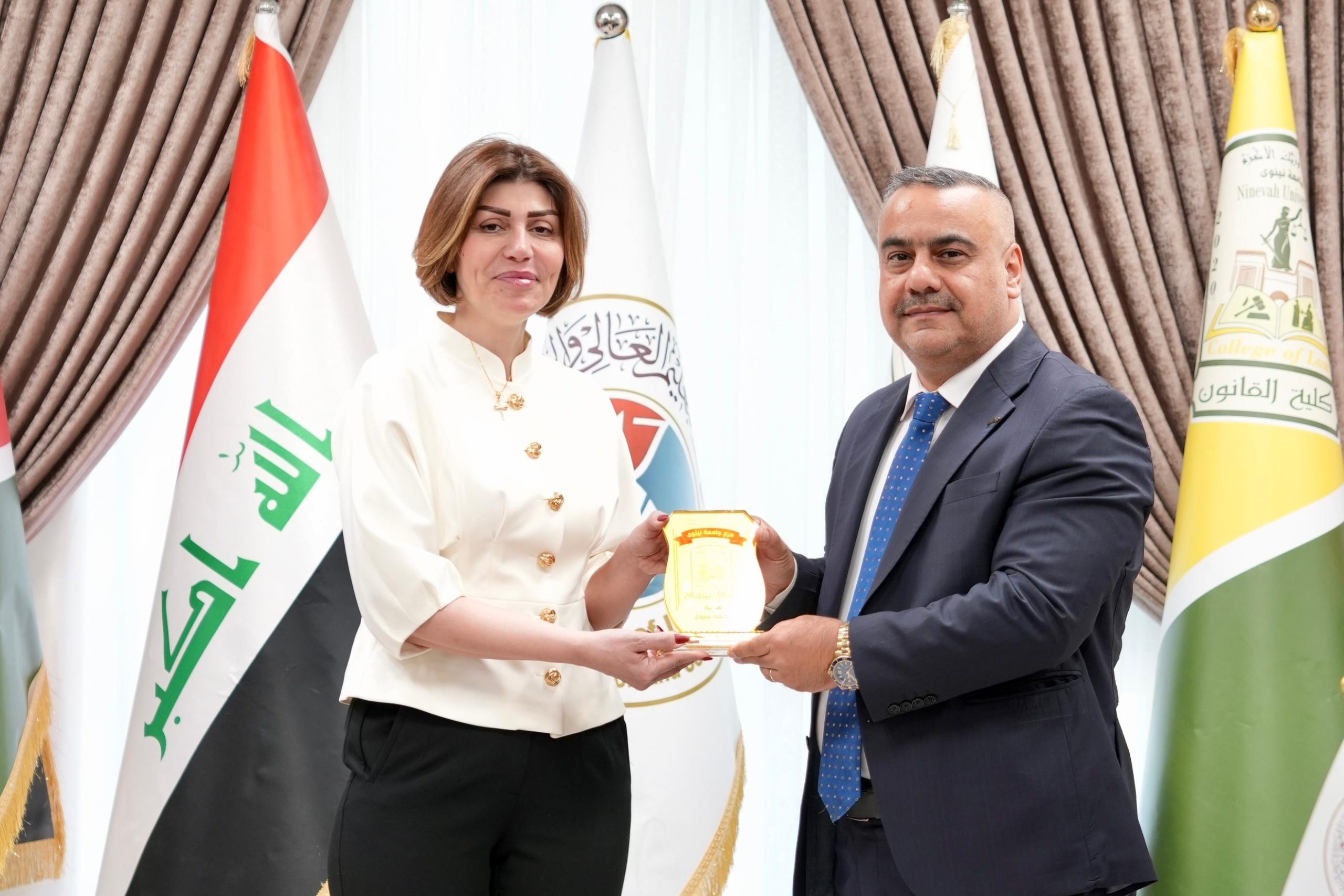 وفي ختام مراسم التوقيع، قدّم رئيس الجامعة درع جامعة نينوى إلى معالي الوزيرة، تعبيرًا عن التقدير والتعاون المشترك، وتم التأكيد على وضع خطة تنفيذية مشتركة لمتابعة بنود المذكرة وتحويلها إلى برامج عملية على أرض الواقع.
