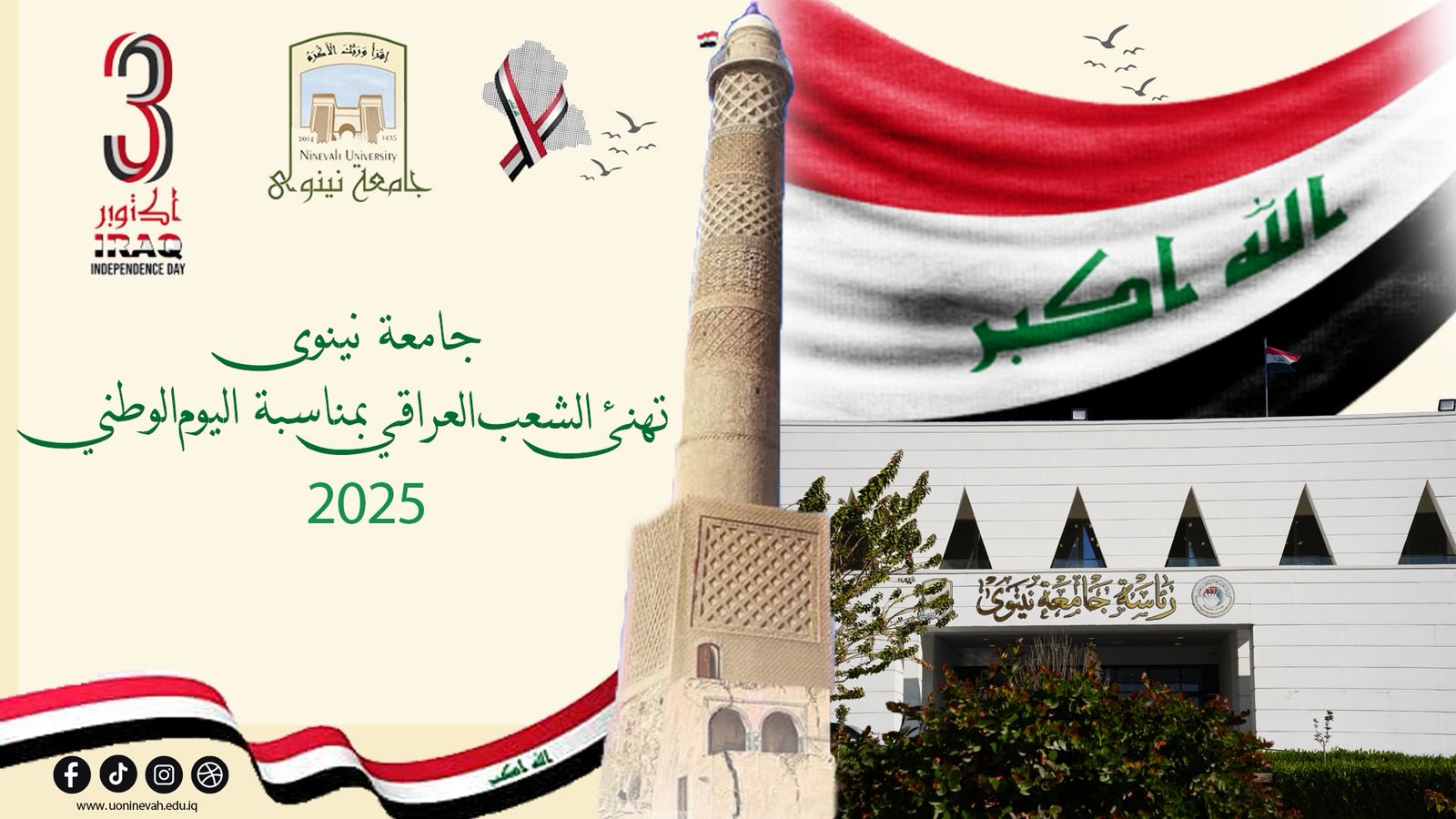 تتشرف جامعة نينوى بدعوة منتسبيها وطلبتها الأعزاء للمشاركة في الاحتفالية التي ستقيمها الجامعة بمناسبة اليوم الوطني العراقي، وذلك يوم غد الأحد الموافق ٥ تشرين الأول ٢٠٢٥، في تمام الساعة العاشرة صباحًا، على رحاب الجامعة في موقع الجوسق.