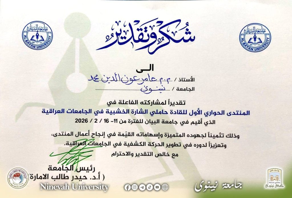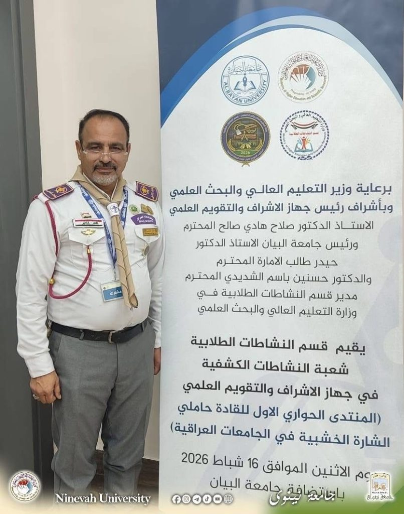 ومثّل الجامعة في هذا المحفل مسؤول شعبة النشاطات الكشفية وحامل الشارة الخشبية (م.م. عامر عون الدين محمد المولى)، حيث نظّم المنتدى جهاز الإشراف والتقويم العلمي / قسم النشاطات الطلابية – شعبة النشاط الكشفي في وزارة التعليم العالي والبحث العلمي، واستضافته جامعة البيان للمدة من (16–17 شباط 2026)، بمشاركة واسعة من ممثلي الجامعات العراقية.