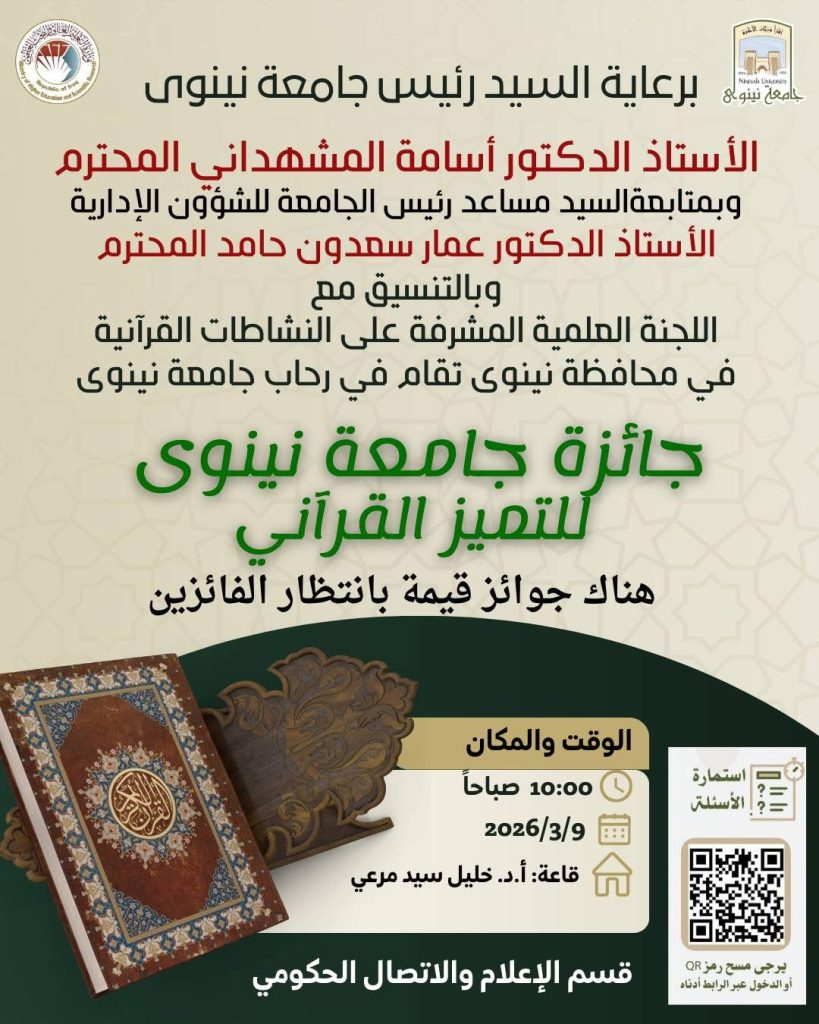 جامعة نينوى تطلق حملة توعوية للتعريف بجائزة التميز القرآني ضمن برامج شهر رمضان المبارك(#نحومجتمع ريادي)