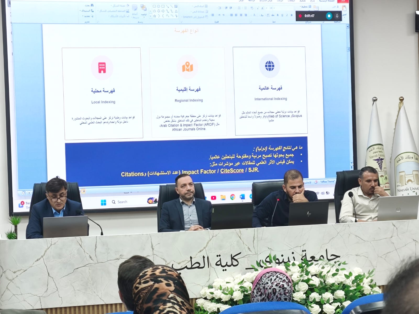 استهدفت هذه الورشة السادة التدريسيين والباحثين وطلبة الدراسات العليا، وهدفت إلى تعزيز المهارات البحثية والأكاديمية من خلال تدريب المشاركين على الاستخدام الأمثل للخدمات الجامعية الإلكترونية وآلية الوصول إلى حساباتهم في المنصات البحثية العالمية مثل Scopus و Web of Science (WoS)، بما يسهم في رفع مستوى الإنتاج العلمي لجامعة نينوى.