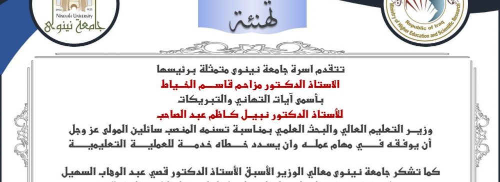 جامعة نينوى تهنئ الاستاذ الدكتور نبيل كاظم عبد الصاحب بمناسبة تسنمه منصب وزير التعليم العالي والبحث العلمي
