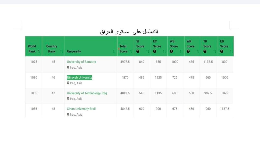 وتؤكد هذه النتائج استمرار جامعة نينوى في تعزيز جهودها ضمن معايير الاستدامة وجودة البيئة الجامعية، سعيًا نحو تحسين موقعها في التصنيفات الدولية، أطيب الأمنيات لجامعتنا العزيزة بالمزيد من التقدّم والتميز.