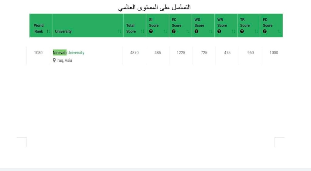 وقد حافظت جامعة نِينوى على موقعها المستقر مقارنة بالعام الماضي رغم ازدياد عدد الجامعات المشاركة هذا العام بواقع 562 جامعة جديدة، إذ جاءت في المركز 1080 عالميًا.