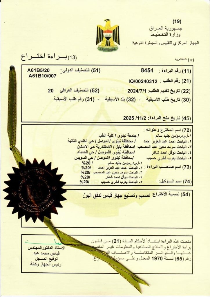 «تصميم وتصنيع جهاز قياس تدفق البول»،الذي يهدف إلى رفع دقة قياس تدفق البول لدى المرضى وتحسين جودة التشخيص السريري في أمراض الجهاز البولي.