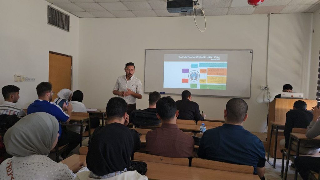 استهدفت المحاضرة طلبة قسم هندسة النظم والسيطرة، وقدمها الأستاذ بهاء الدين خضر عطية السبعاوي، مسؤول وحدة حقوق الإنسان في الكلية، حيث تناول خلالها نبذة تعريفية بحقوق الإنسان، مسلطاً الضوء على أهميتها ودورها في تعزيز بيئة جامعية قائمة على الاحترام المتبادل، والتعايش، والالتزام بالقيم الإنسانية.