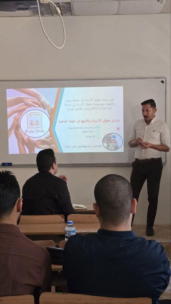 برعاية رئاسة جامعة نينوى، أقامت شعبة حقوق الإنسان في الجامعة وبالتعاون مع وحدة حقوق الإنسان في كلية هندسة الإلكترونيات، يوم الأربعاء الموافق ٢٠٢٥/١٠/١، محاضرة بعنوان: