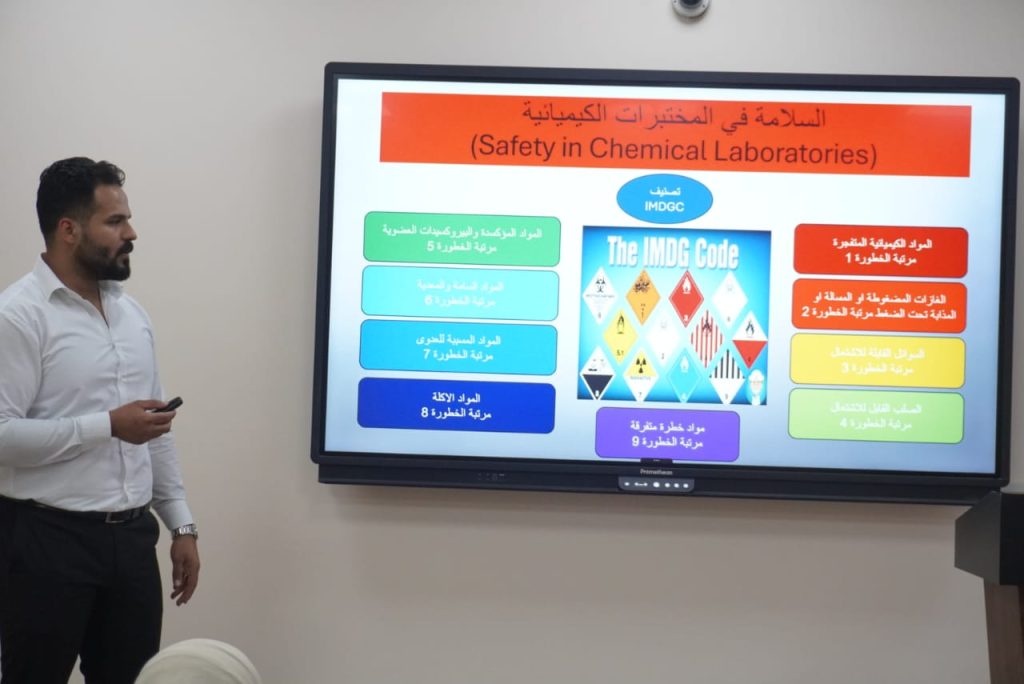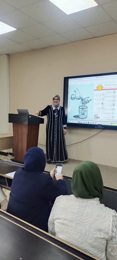 حيث تضمنت الدورة محاضرات علمية وتطبيقية تناولت موضوعات متنوعة تتعلق بالسلامة العامة والكيميائية في المختبرات، مع التركيز على أهم المخاطر المرتبطة بالمواد الكيميائية وطرق التعامل الآمن معها، إضافة إلى استعراض متطلبات إدارة السلامة والصحة المهنية (OSHA) وآلية قراءة بيانات سلامة المواد (MSDS)، بما ينسجم مع المعايير الدولية المعتمدة.