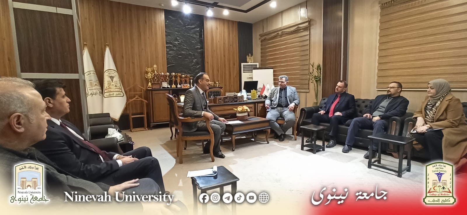 وكان في استقبال الوفد الأستاذ المساعد الدكتور مؤمن جنيد الدبوني عميد الكلية، والدكتور علي عباس معاون العميد للشؤون الإدارية، إلى جانب عدد من تدريسيي الكلية، حيث جرى خلال اللقاء مناقشة آليات دعم التدريب السريري والبرامج التعليمية، وتبادل الخبرات، وإقامة الأنشطة العلمية المشتركة بما يسهم في تطوير التعليم الطبي وخدمة القطاع الصحي في محافظة نينوى.