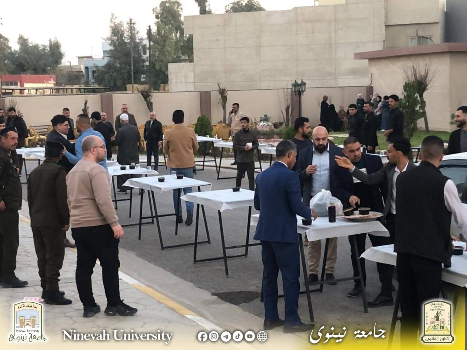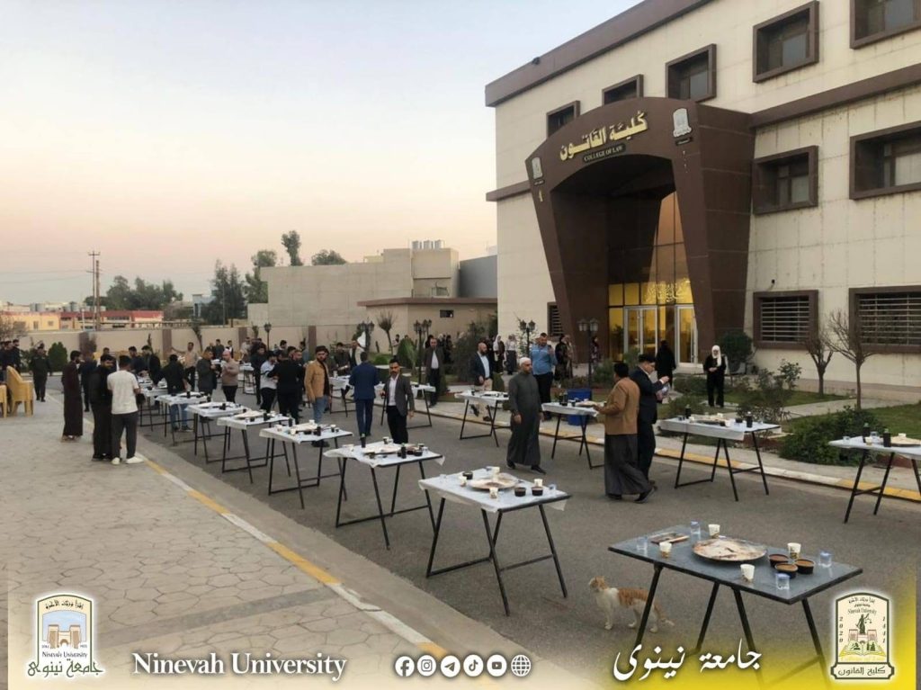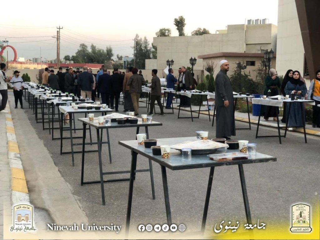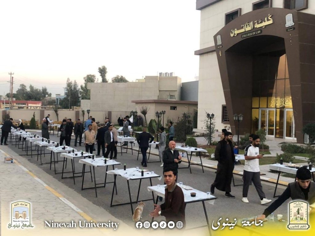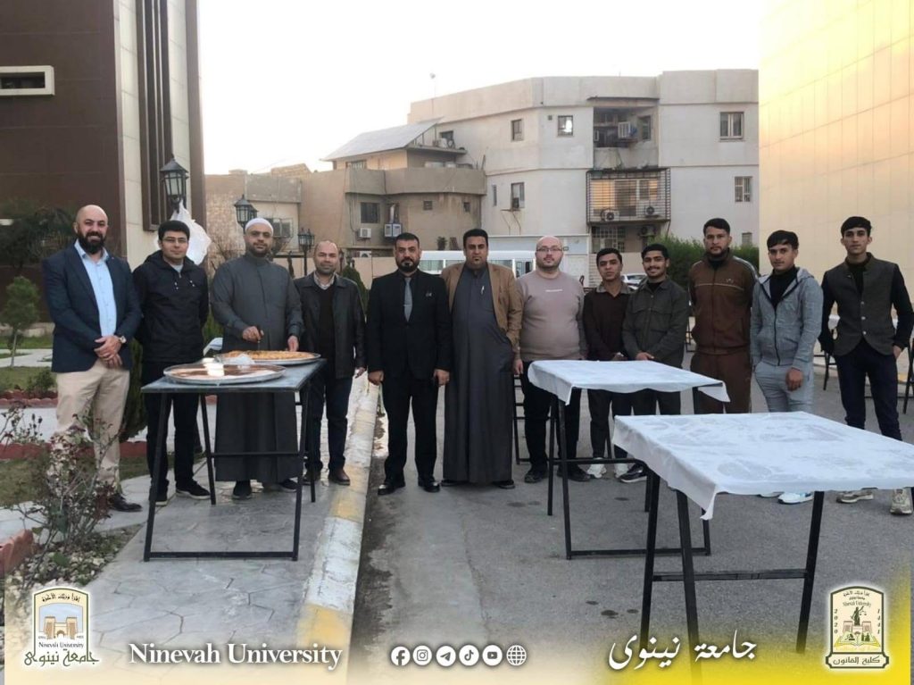 في إطار تعزيز القيم الإنسانية والاجتماعية التي تحرص جامعة نينوى على ترسيخها في بيئتها الجامعية، وبرعاية كريمة من السيد رئيس الجامعة الأستاذ الدكتور أسامة إسماعيل المشهداني، وبإشراف السيدة عميد كلية القانون الأستاذة الدكتورة زينة غانم العبيدي، وبحضور السيد معاون العميد للشؤون الإدارية والمالية الدكتور خلدون فاضل، أقامت عمادة الكلية يوم الاثنين الموافق 6 رمضان 1447هـ، المصادف 23/2/2026، مأدبة إفطار جماعية وأمسية رمضانية لطلبة الأقسام الداخلية.