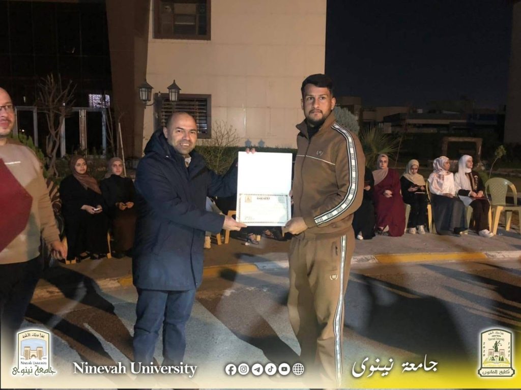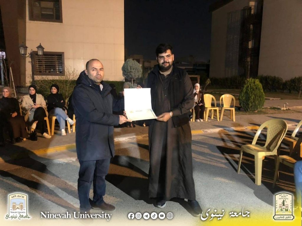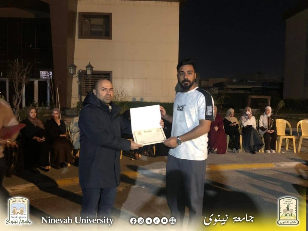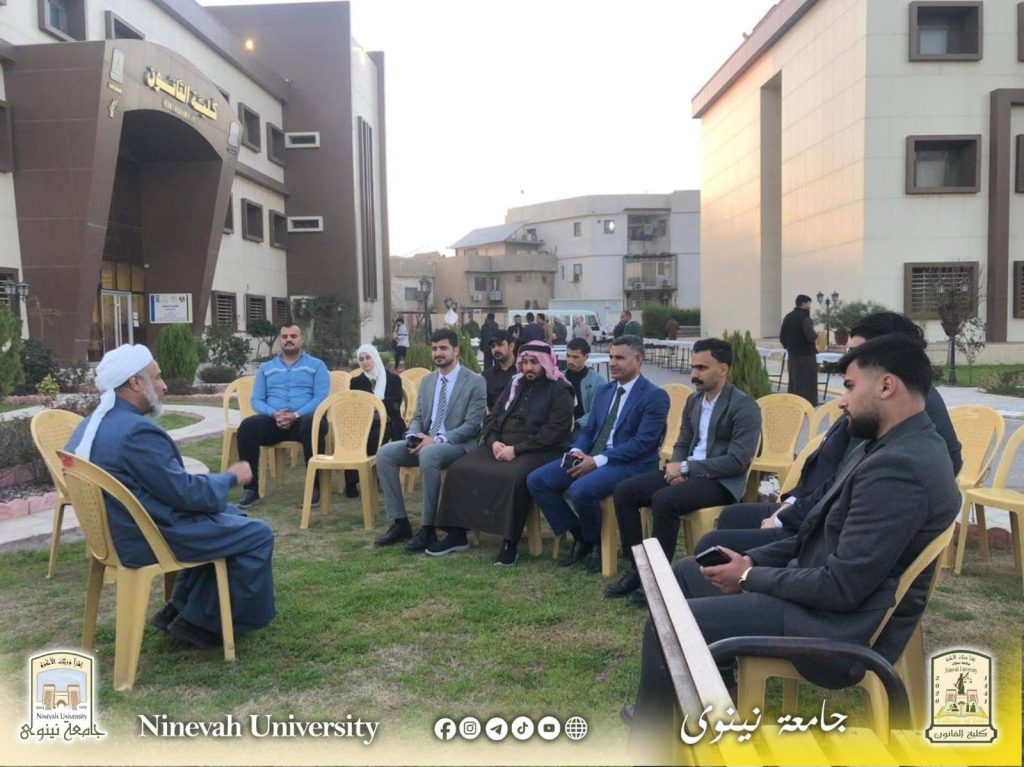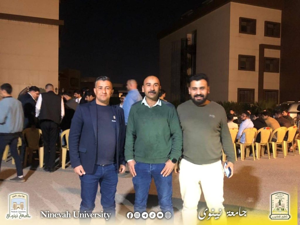 في إطار تعزيز القيم الإنسانية والاجتماعية التي تحرص جامعة نينوى على ترسيخها في بيئتها الجامعية، وبرعاية كريمة من السيد رئيس الجامعة الأستاذ الدكتور أسامة إسماعيل المشهداني، وبإشراف السيدة عميد كلية القانون الأستاذة الدكتورة زينة غانم العبيدي، وبحضور السيد معاون العميد للشؤون الإدارية والمالية الدكتور خلدون فاضل، أقامت عمادة الكلية يوم الاثنين الموافق 6 رمضان 1447هـ، المصادف 23/2/2026، مأدبة إفطار جماعية وأمسية رمضانية لطلبة الأقسام الداخلية.