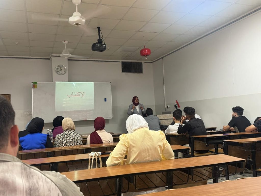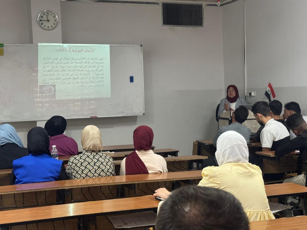 قدّم المحاضرة كلٌّ من م. غادة محمود فيصل و م.م زهراء أحمد، واستهدفت طلبة المرحلة الرابعة، حيث تناولت تعريف الاكتئاب وأبرز أسبابه النفسية والاجتماعية، والعوامل التي تسهم في ظهوره لدى فئة الشباب الجامعي.