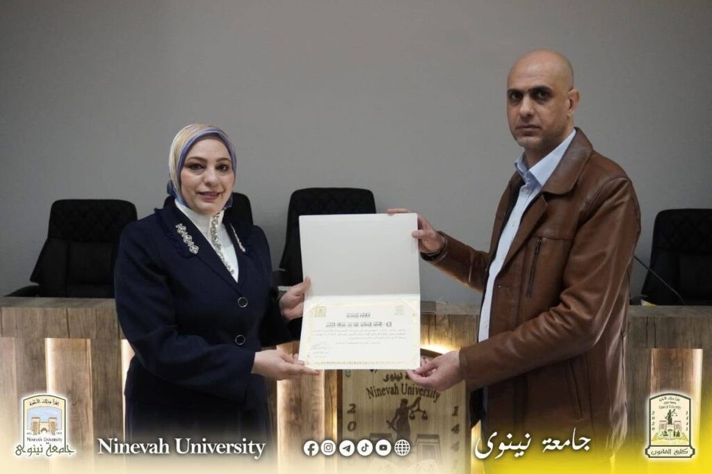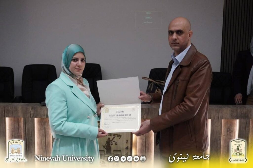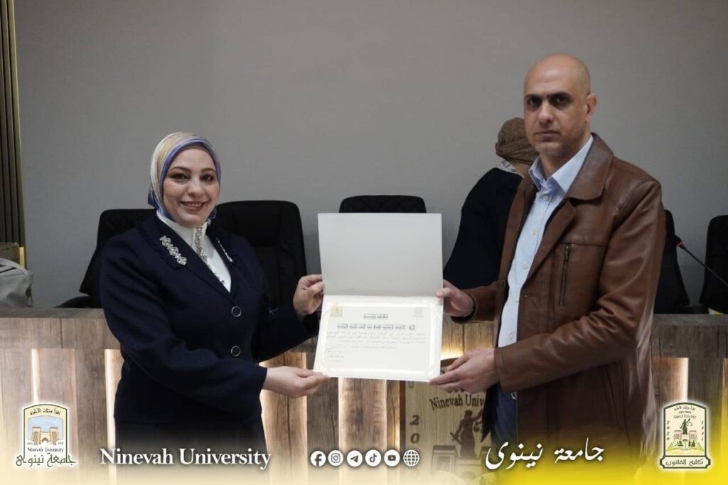 وفي ختام الورشة، تم تكريم السادة المشاركين بشهادات تقديرية من قبل السيد معاون العميد للشؤون العلمية الدكتور أديب محمد جاسم الحماوي، وبحضور السيد رئيس فرع القانون الخاص الدكتور عمار ثامر البناء ، تقديراً لجهودهم المبذولة في إنجاح هذه الفعالية.