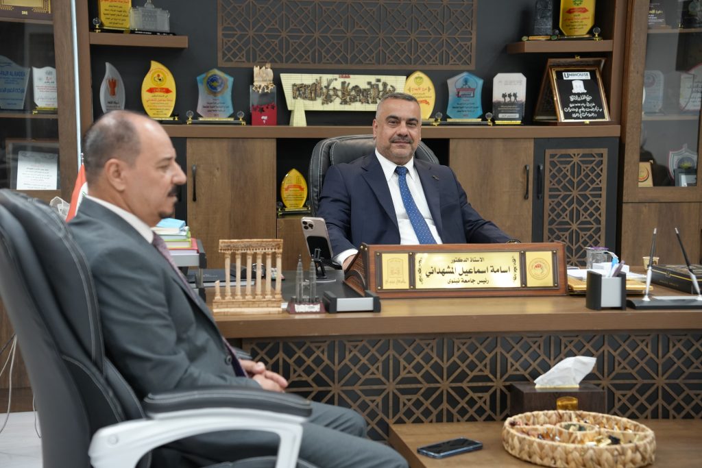 إستقبل السيد رئيس جامعة نينوى الأستاذ الدكتور أسامة المشهداني ، يوم الإثنين الموافق ٢٠٢٥/٥/٥ ، مدير معرض البيت الموصلي لتجارة الأجهزة الكهربائية متمثلا بمديره الشيخ سامي عيدان اللهيبي ، وبرفقة الأستاذ الدكتور صالح ارديني ، والوفد المرافق لهم.
