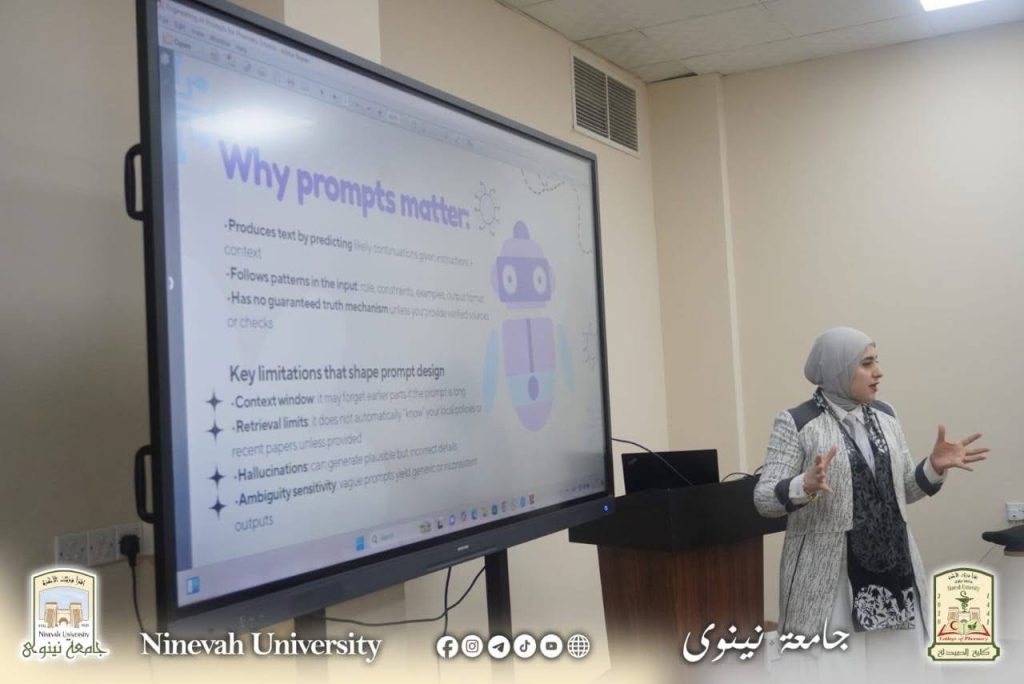 ضمن نشاطات وحدة التعليم المستمر، نظّمت كلية الصيدلة في جامعة نينوى محاضرة علمية بعنوان (هندسة الأوامر للذكاء الاصطناعي في تعليم الصيدلة)، تناولت مفهوم صياغة الأوامر والتوجيهات الذكية للأنظمة المعتمدة على الذكاء الاصطناعي، من خلال طرح التساؤل العلمي: