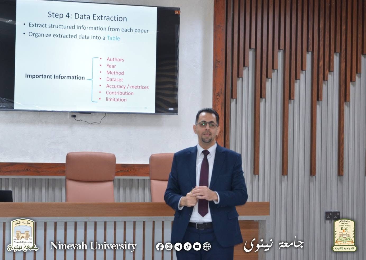 برعاية السيد رئيس جامعة نينوى الأستاذ الدكتور أسامة إسماعيل المشهداني، وبإشراف السيد مساعد رئيس الجامعة للشؤون العلمية الأستاذ الدكتور جعفر رمضان محمد، نظّمت عمادة كلية هندسة الإلكترونيات ورشة عمل حضورية لطلبة الدراسات العليا (الماجستير والدكتوراه) بعنوان: “إعداد المراجعة المنهجية للأدبيات في البحوث العلمية”.أُقيمت الورشة يوم الأربعاء الموافق 21/04/2026، وقدّمها التدريسي في قسم هندسة الحاسوب والمعلوماتية...