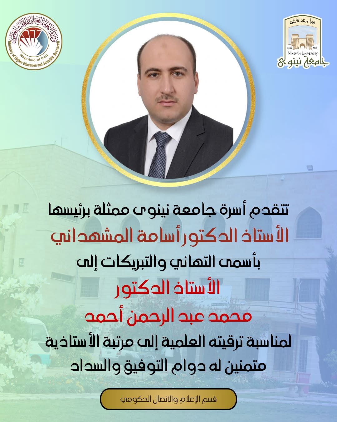 يتقدم السيد رئيس جامعة نينوى الأستاذ الدكتور أسامة إسماعيل المشهداني بأسمى آيات التهاني والتبريكات إلى الدكتور محمد عبد الرحمن أحمد، التدريسي في كلية هندسة الإلكترونيات، بمناسبة صدور الأمر الجامعي بترقيته العلمية من مرتبة أستاذ مساعد إلى مرتبة أستاذ في اختصاص الاتصالات الرقمية.وأشار إلى أن جامعة نينوى ماضية في دعم كوادرها التدريسية وتوفير البيئة العلمية الرصينة...