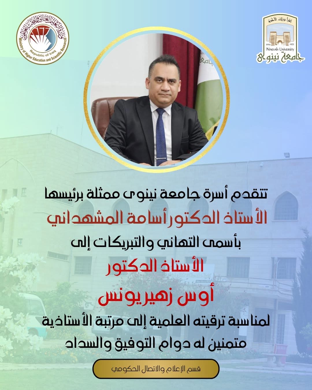 في إنجاز أكاديمي متميز يُضاف إلى رصيد جامعة نينوى، حظي التدريسي في جامعة نينوى من الموفدين للدراسة في الولايات المتحدة الأمريكية السيد (مهند حسام الدين أحمد المزين) بتكريم رفيع من Phi Kappa Phi، وذلك بعد ترشيحه من قبل University of Arkansas at Little Rock تقديراً لتفوقه العلمي، حيث صُنّف ضمن نخبة طلبة الدراسات العليا المتميزين...Read More