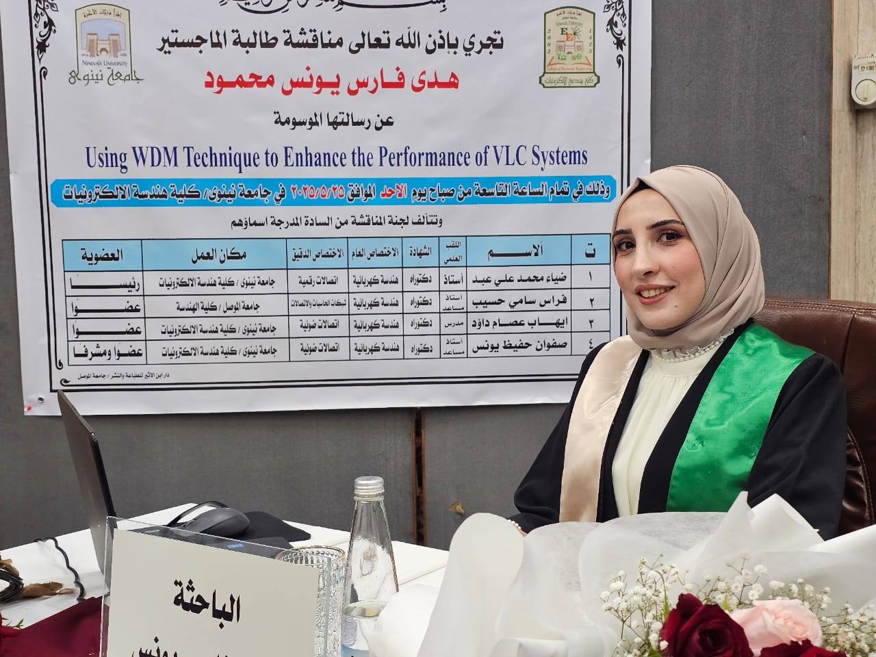 بحثت رسالة الماجستير في جامعة نينوى/ كلية هندسة الالكترونيات/ قسم هندسة الاتصالات للطالبة (هدى فارس يونس) يوم الأحد الموافق ٢٠٢٥/٥/٢٥ ، (استخدام تقنية تقسيم الطول الموجي المتعدد لتحسين أداء أنظمة الاتصالات