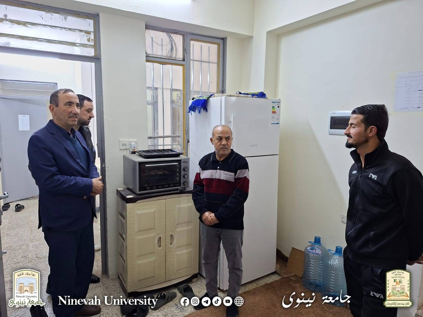 استنادا لتوجيهات السيد رئيس الجامعة وضمن حرص عمادة الكلية على متابعة أوضاع الطلبة وتقديم الدعم لهم، أجرى السيد عميد كلية هندسة الإلكترونيات الأستاذ الدكتور خالد خليل محمد، يرافقه السيد المعاون الإداري، يوم الأحد الموافق 8 آذار 2026، زيارة ميدانية إلى طلبة الأقسام الداخلية في مجمع الأندلس والمتنبي.