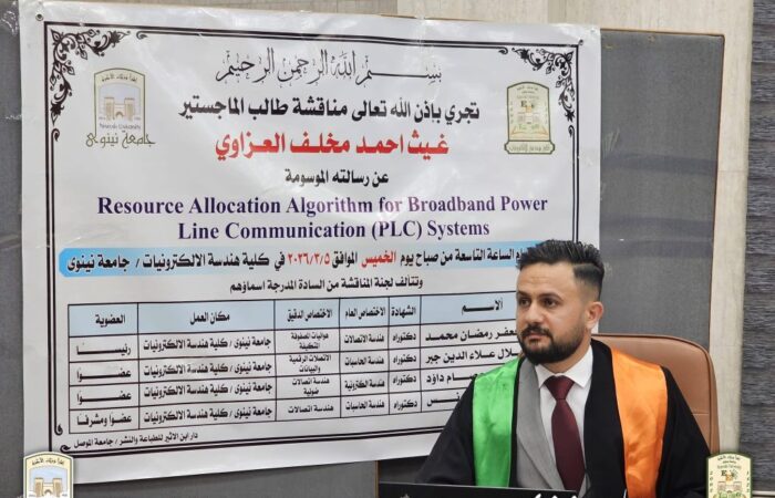 بحثت رسالة ماجستير في جامعة نينوى / كلية هندسة الإلكترونيات، للطالب غيث أحمد مخلف، يوم الخميس الموافق 5 آذار 2026، الموسومة: “خوارزمية تخصيص الموارد لأنظمة اتصالات خطوط الطاقة ذات النطاق العريض (PLC)”(Resource Allocation Algorithm for Broadband Power Line Communication (PLC) Systems).تناولت الرسالة تقنية الاتصالات عبر...