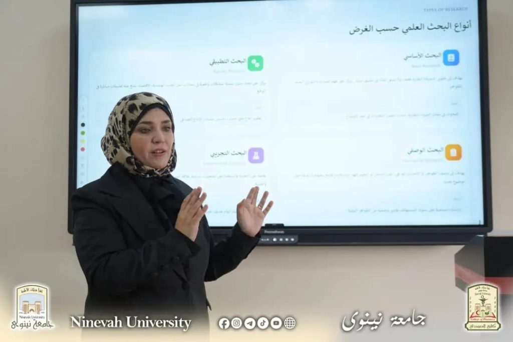 As part of its strategic plan aimed at enhancing research skills and refining students’ scientific competencies, and within the activities of the Rehabilitation and Employment Unit, the College of Pharmacy at the University of Ninevah organized a scientific workshop on Thursday, February 26, 2026, entitled “Scientific Research Methodology for Students.” This initiative reflects the college’s commitment to preparing a qualified academic generation equipped with solid research tools and capable of competing in scientific forums.