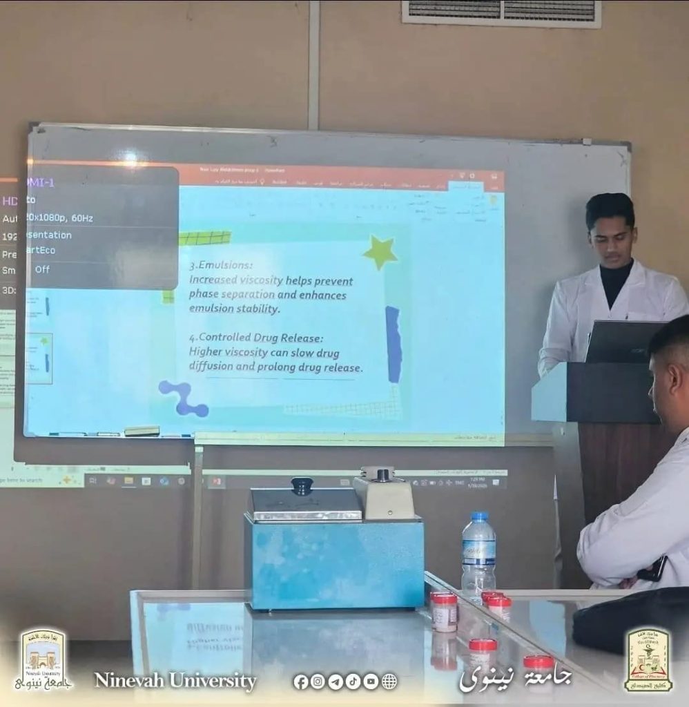 As part of the scientific activities organized by the College of Pharmacy – University of Ninevah for the academic year 2025–2026, and with the aim of enhancing learning skills among first-year students, the Department of Pharmaceutical Chemistry / Medical Physics Laboratory held a series of scientific discussion sessions for first-year students within the Medical Physics course. The sessions took place on Sunday, January 18, 2026.