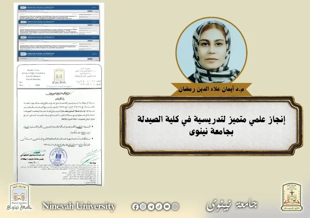 In a new scientific achievement added to the research record of the University of Ninevah, Dr. Iman Alaa Al-Din Ramadan, a lecturer at the College of Pharmacy, University of Ninevah, in collaboration with a research team from the University of Mosul, successfully registered four new fungal isolates for the first time in the global database of the National Center for Biotechnology Information (NCBI), which is considered one of the most prominent internationally recognized databases in the field of life sciences.