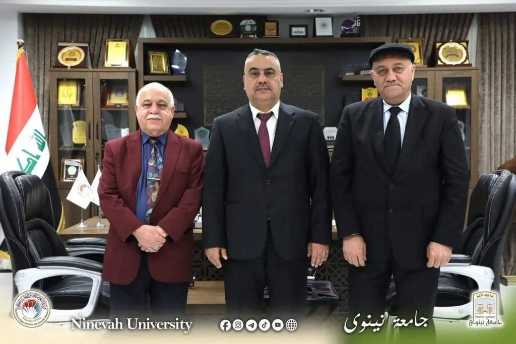 The President of the University of Ninevah, Professor Dr. Osama Al-Mashhadani, received a delegation from the Council of the A‘laarJia Al-Naqeeb Lineages in Mosul, comprising Dr. Ahmed Dakheel Al-Naqeeb and Mr. Hassanein Al-Naqeeb, on the occasion of donating the second edition of the book entitled Nuqabaa’ Almosul / The Branch of the Forefathers in the House of Ahl al-Abaa’ / Descendants of Ubayd Allah Al-Aaraji, in its five volumes, to the University of Ninevah.