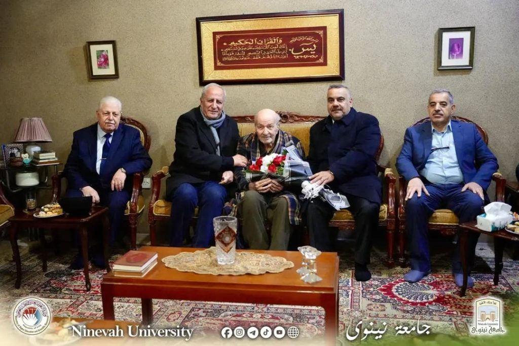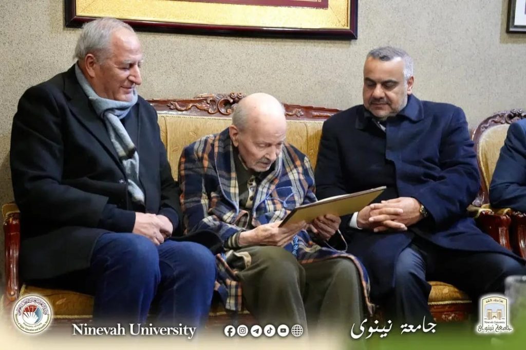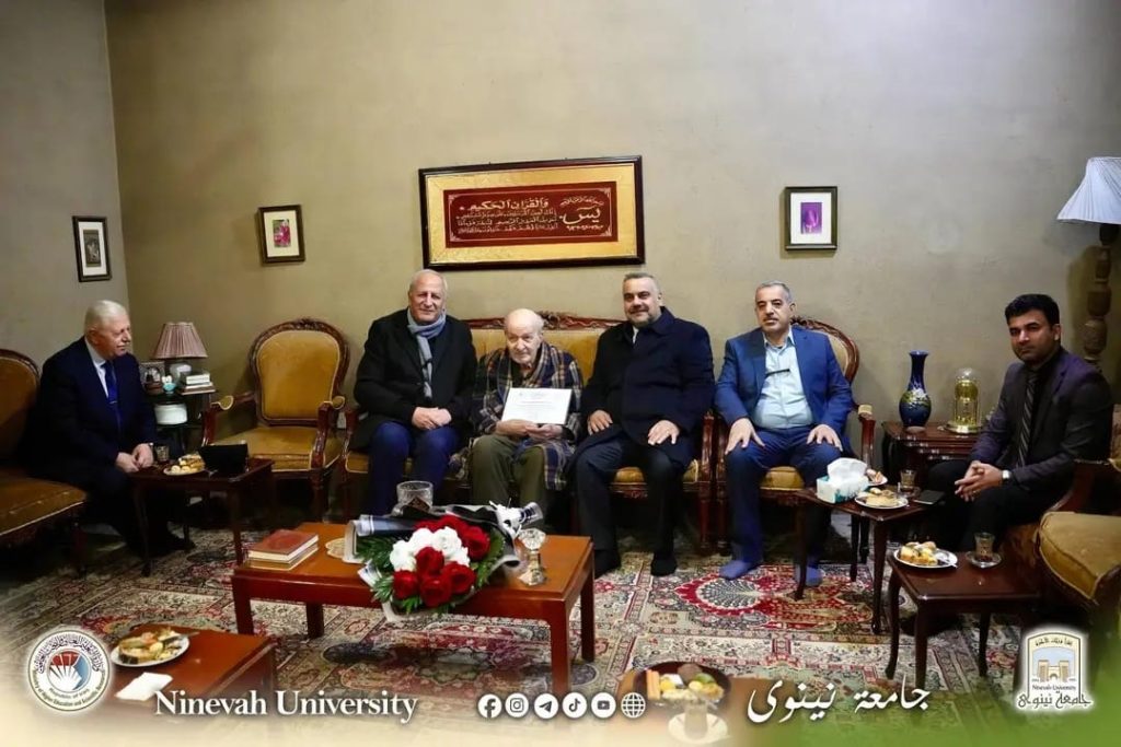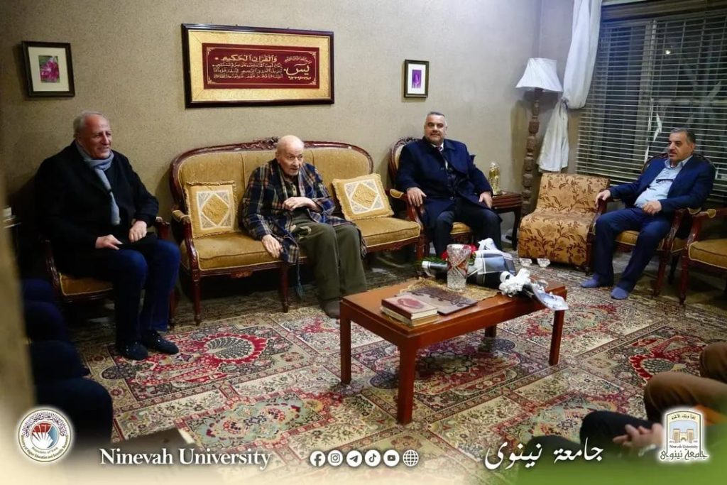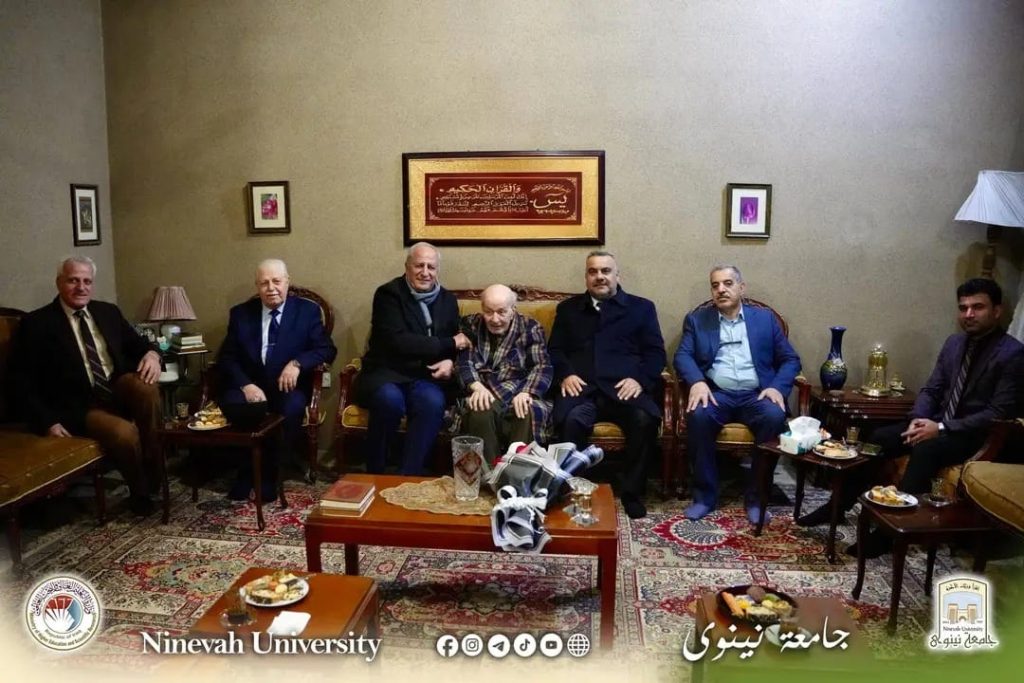 Professor Dr. Osama Ismail Al-Mashhadani, President of the University of Ninevah, accompanied by Professor Dr. Muzahim Al-Khayyat and a number of faculty members, paid a visit to Professor and physician Dr. Abdulilah Ahmed Al-Jawadi, one of the most prominent figures in medicine in Mosul and Iraq, and among the pioneers who played a significant role in establishing the scientific foundations of medical practice in the city.