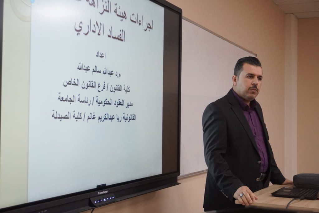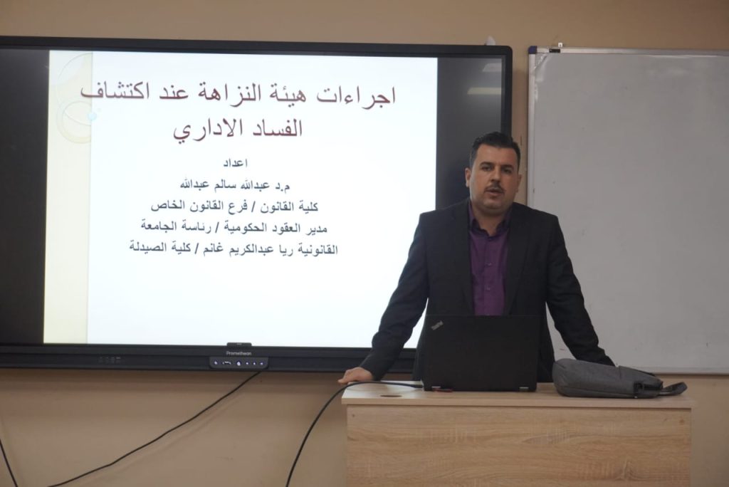 The Continuing Education Unit at the College of Pharmacy – University of Ninevah organized an educational workshop on Tuesday, 16 December 2025, entitled “Integrity Commission Procedures upon Detecting Administrative Corruption”, held at the College of Pharmacy Hall, under the supervision of Assistant Professor Dr. Maysar Al-Qutachi, Dean of the College.