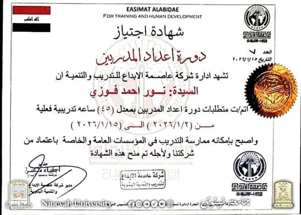 Student Noor Ahmed Fawzi from the Department of Biomedical Engineering at the College of Electronic Engineering – University of Ninevah achieved a distinguished academic accomplishment through her participation in the International Training of Trainers (TOT) Program, organized in cooperation between the American Board in Iraq and Creative Capital International Company.