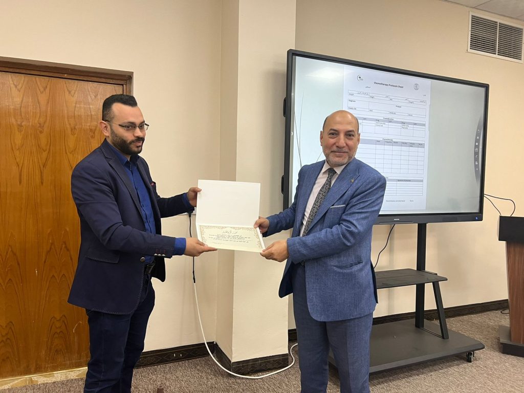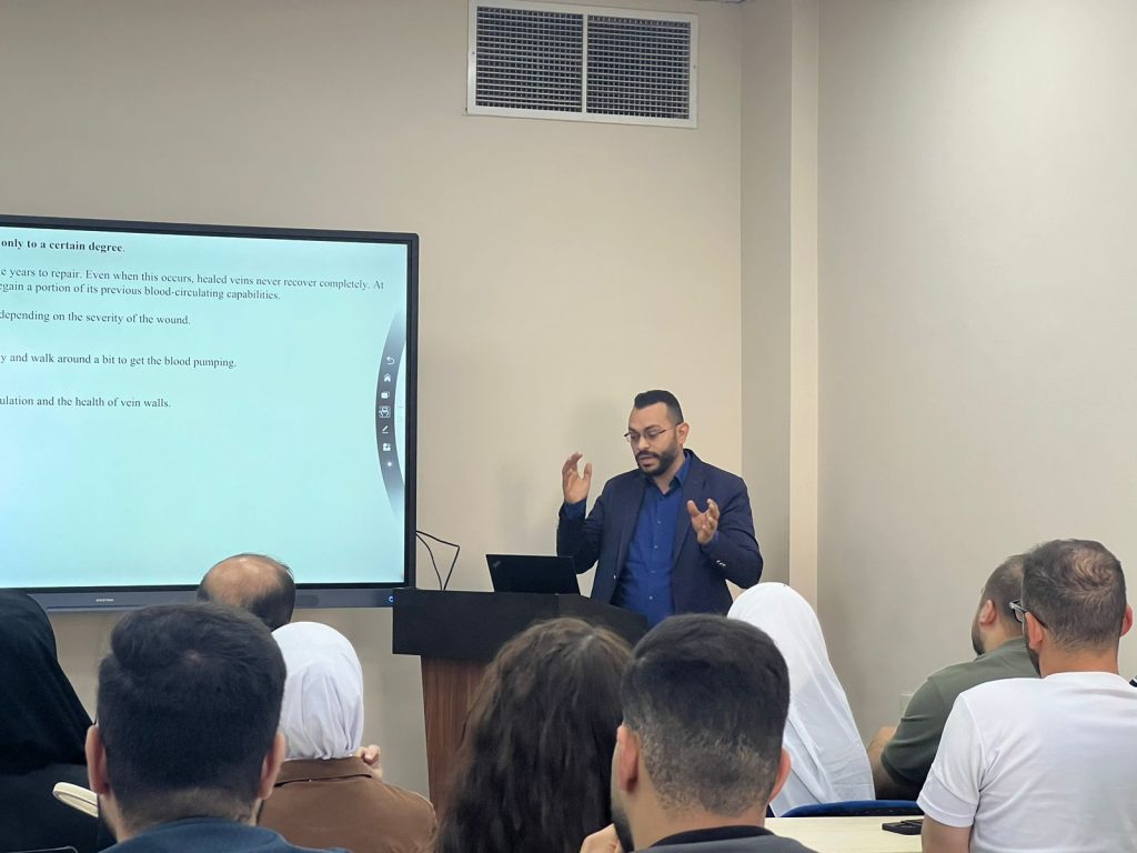 The lecture was delivered by Clinical Pharmacist Ibrahim Ismail Sado from the Nineveh Health Directorate. He discussed the vital role played by clinical pharmacists in hospitals and healthcare institutions, as well as their significant contribution to improving the quality of pharmaceutical care and ensuring patient safety.