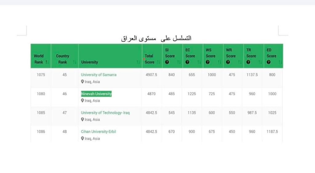 These results reaffirm the University of Ninevah’s ongoing efforts to strengthen its performance in sustainability standards and the quality of the campus environment, striving to improve its position in international rankings.