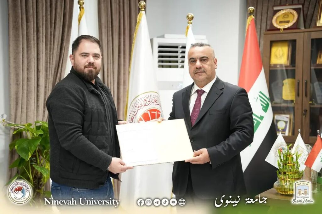The President of the University of Ninevah, Professor Dr. Osama Al-Mashhadani, honored Assistant Lecturer Yazan Nafi Mahmoud from the University of Ninevah and researcher Zaid Abdul Nafi Saeed from the Northern Technical University, in recognition of their scientific efforts in preparing a study entitled: