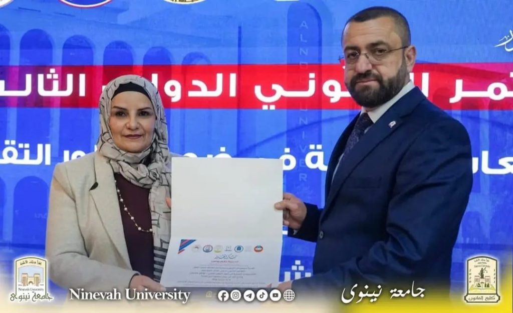 The session was chaired by Professor Dr. Qabas Hasan Awad from the University of Mosul, alongside Professor Dr. Zeina Ghanem Al-Obaidi, Dean of the College of Law at the University of Ninevah; Professor Dr. Abdulaziz Ramadan Ali, Dean of the College of Law at the University of Mosul; Assist. Prof. Dr. Ahmed Mustafa Ali, Dean of the College of Law and Political Science at Al-Noor University; Professor Dr. Hashim Mohammed Ahmed, Dean of the College of Law at Al-Hadbaa University; and Professor Dr. Anas Mahmoud Khalaf, Assistant Dean for Administrative Affairs at the College of Law, Al-Hamdaniya University.