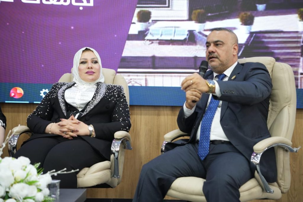 The university was represented at the forum by the President of the University of Ninevah, Professor Dr. Osama Al-Mashhadani, accompanied by the Assistant President for Scientific Affairs, Professor Dr. Jaafar Ramadan Mohammed, and the Director of the Continuing Education Center, Dr. Abeer Mansour.