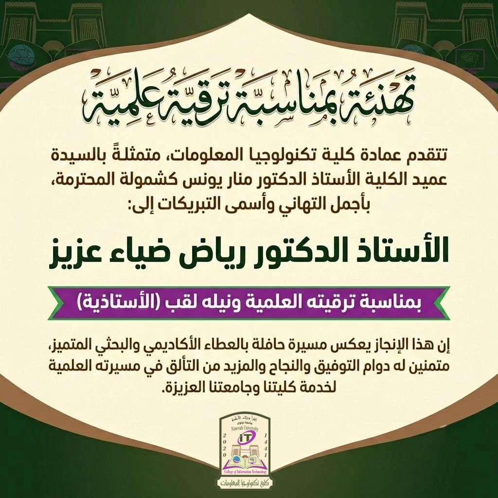 بمناسبة ترقيته العلمية ونيله لقب (الأستاذية). إن هذا الإنجاز يعكس مسيرة حافلة بالعطاء الأكاديمي والبحثي المتميز، متمنين له دوام التوفيق والنجاح والمزيد من التألق في مسيرته العلمية لخدمة كليتنا وجامعتنا العزيزة.